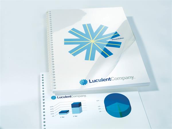 Az áttetsző előlap modern külsőt kölcsönöz a bekötött dokumentumnak és védi a lapokat a sérülésektől.