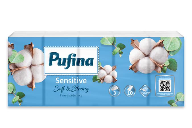 Papír zsebkendő, 3 rétegű, 10x10 db, PUFINA "Sensitive"