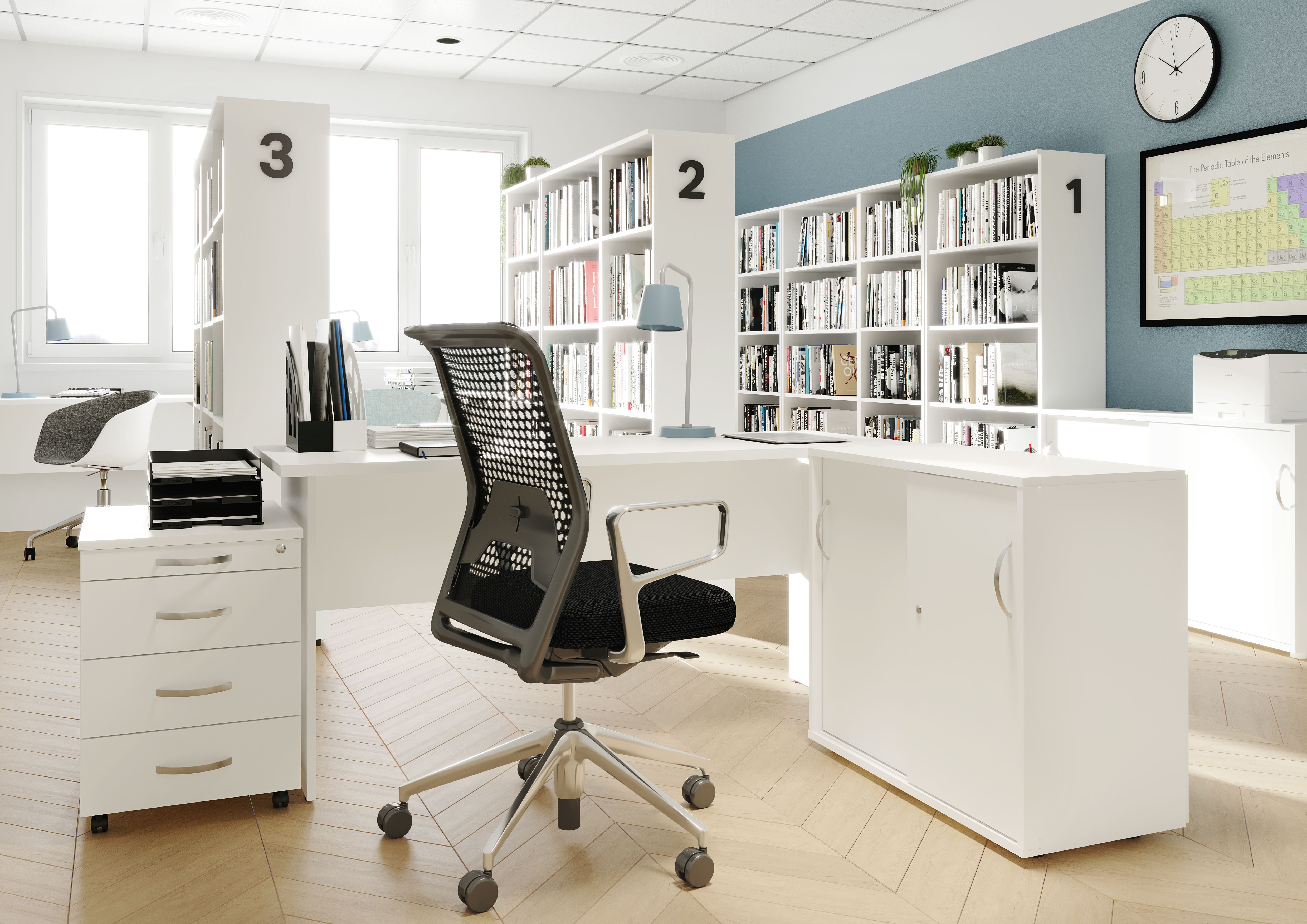 A fehér színváltozat új dimenziókat nyit a belsőépítészeti lehetőségek terén. Ezzel a letisztult, modern megjelenéssel bármilyen tér fiatalos és elegáns stílust ölthet. Visszafogott, sötétebb színekkel és fém kiegészítőkkel kombinálva elegáns hatást érhetünk el, ha pedig élénk színű kiegészítőkkel ötvözzük, vidám és energiával teli irodai környezetet hozhatunk létre. A skandináv stílus szerelmesei is tökéletes alapot kapnak a fehér bútorokkal: lágy pasztell vagy natúr színekkel kiegészítve meleg és barátságos lesz az eredmény.