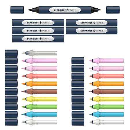 KezdőlapIrodaszerekÍrószerekGrafikai és művészeti termékekKétvégű marker készlet, 27 darabos, SCHNEIDER "Paint-It 040 Twin marker Set 2", 10 különböző szín