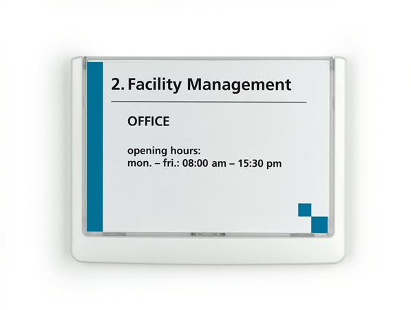 KezdőlapÜzemeltetésLétesítmény üzemeltetésInformációs és tájékoztató jelekInformációs tábla, 149x105,5 mm, DURABLE "CLICK SIGN", fehér